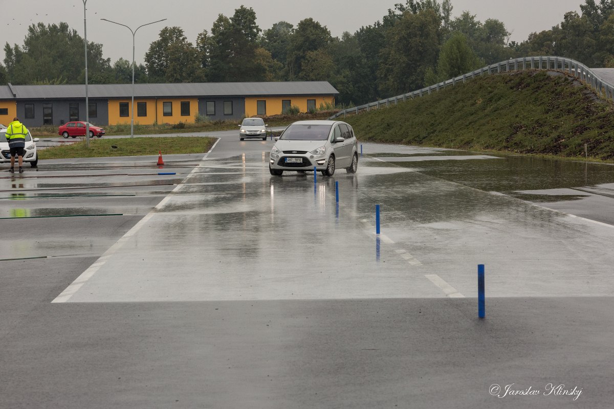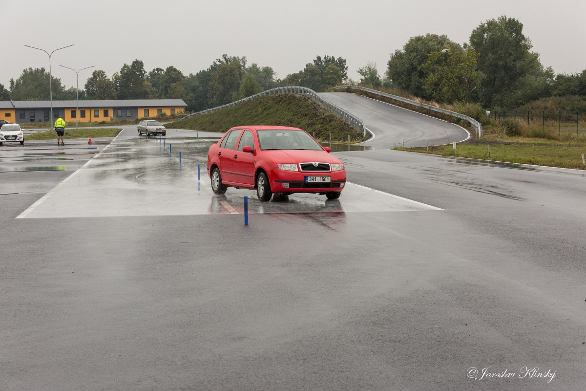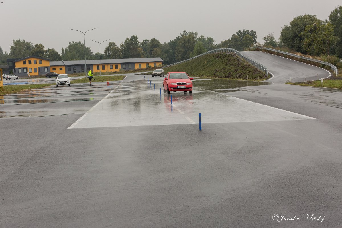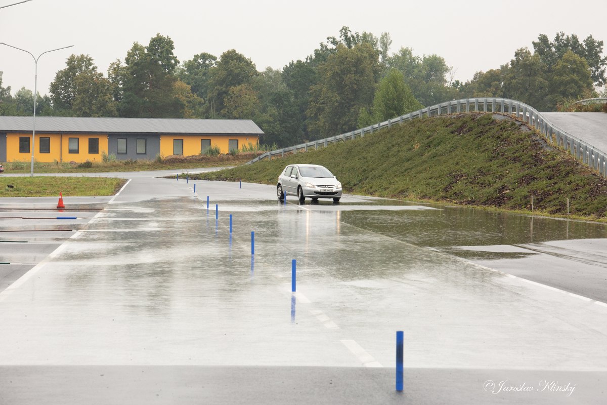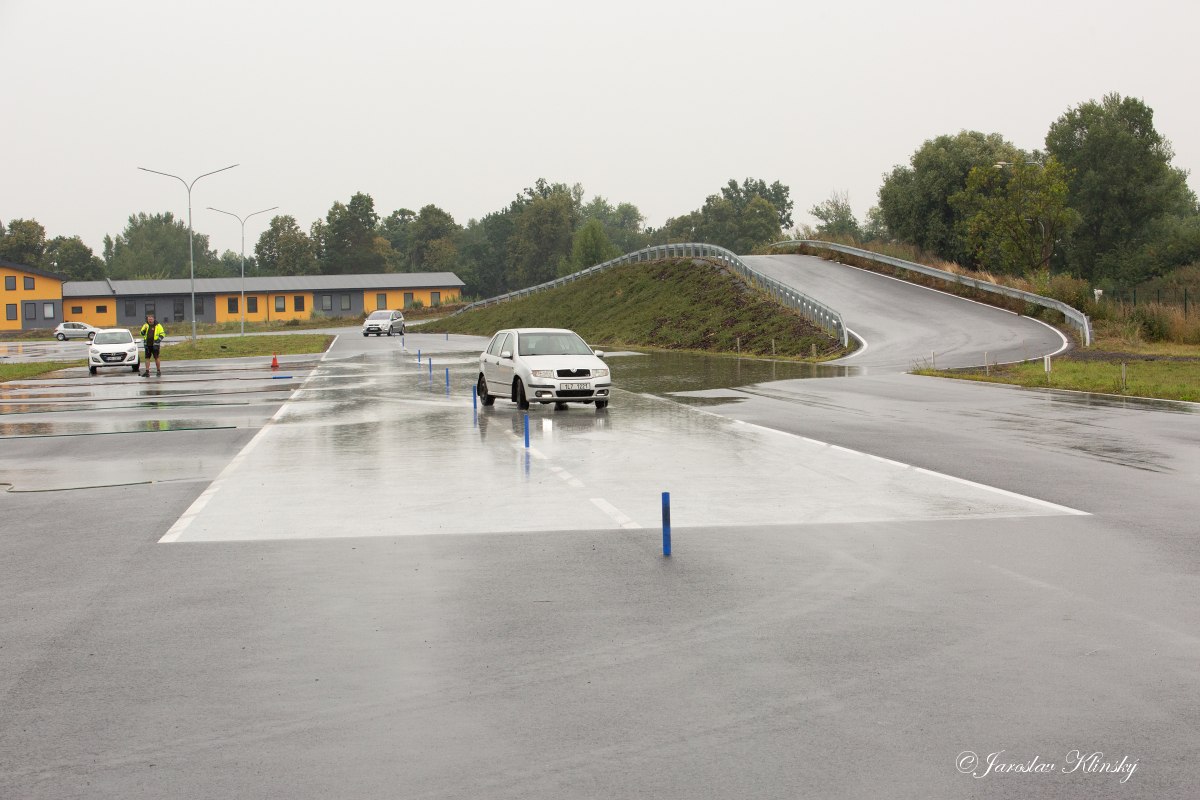 Dalším blokem pro naši skupinu byla jízda do začátky vyšší rychlostí, abychom se naučili zvládat vzniklý smyk. Část vozovky byla natřena speciální barvou, která pod vodou klouzala – simulace ujetého sněhu. Nějak se mi nedařilo auto utrhnout, musel jsem jet opravdu rychleji, abych šel trochu do smyku. Ale někteří kolegové a kolegyně jeli tak, že minuli tuto natřenou plochu…