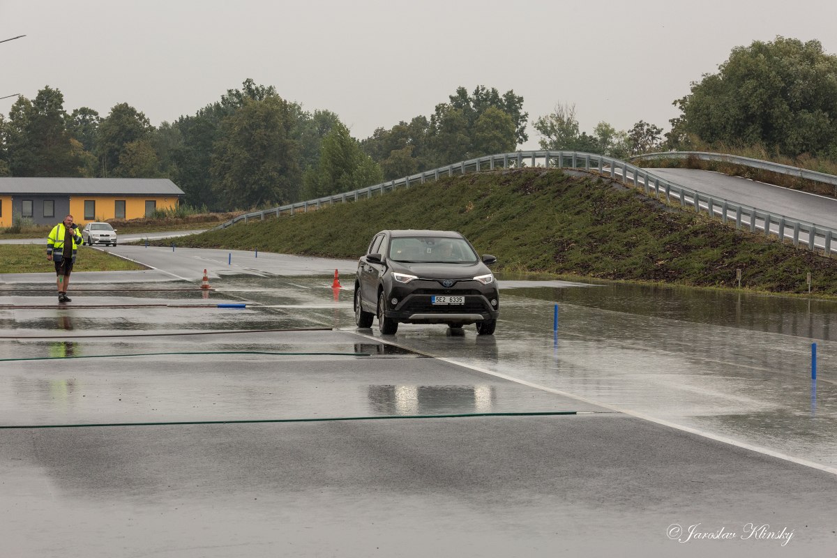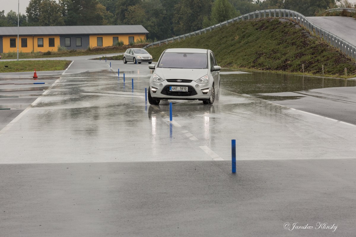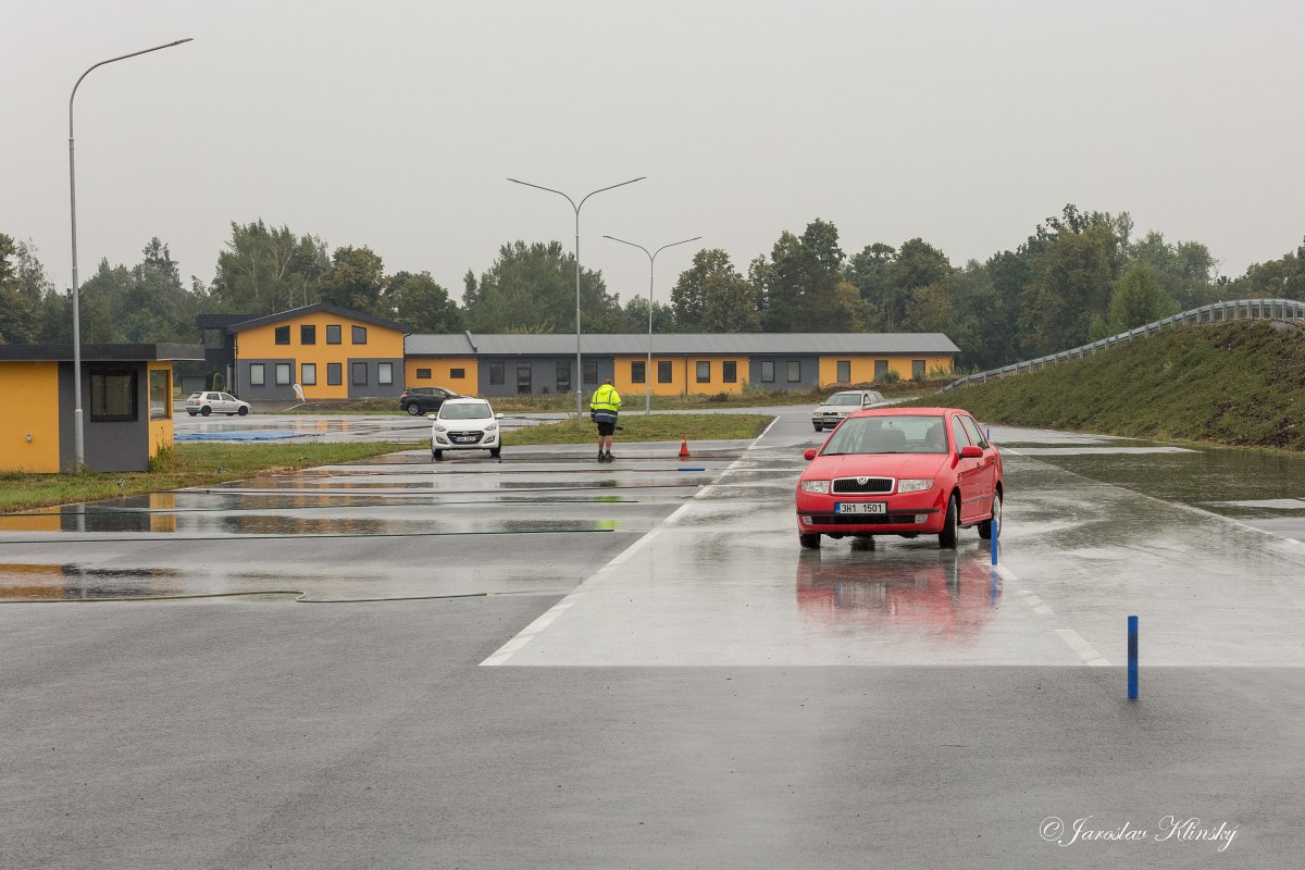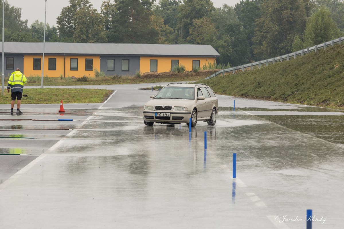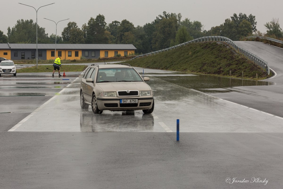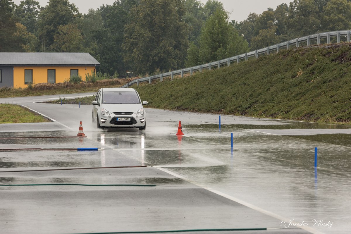 Dalším blokem pro naši skupinu byla jízda do začátky vyšší rychlostí, abychom se naučili zvládat vzniklý smyk. Část vozovky byla natřena speciální barvou, která pod vodou klouzala – simulace ujetého sněhu. Nějak se mi nedařilo auto utrhnout, musel jsem jet opravdu rychleji, abych šel trochu do smyku. Ale někteří kolegové a kolegyně jeli tak, že minuli tuto natřenou plochu…