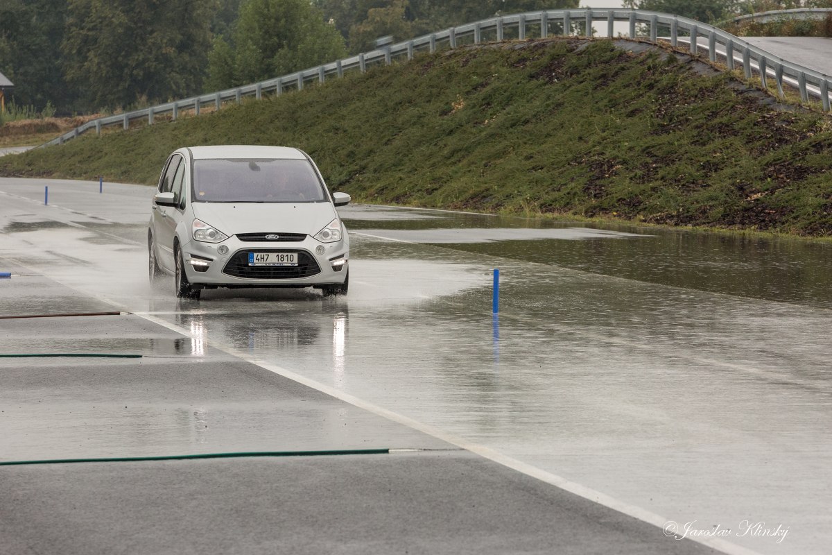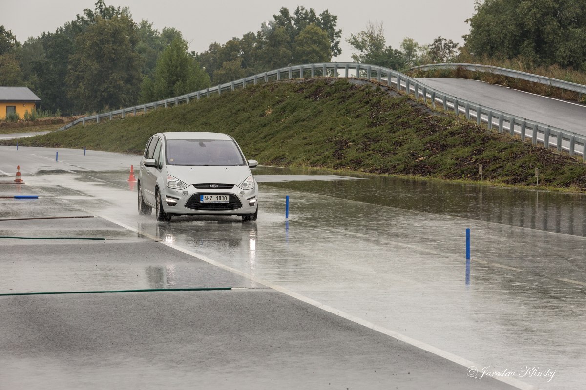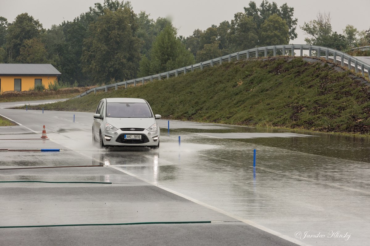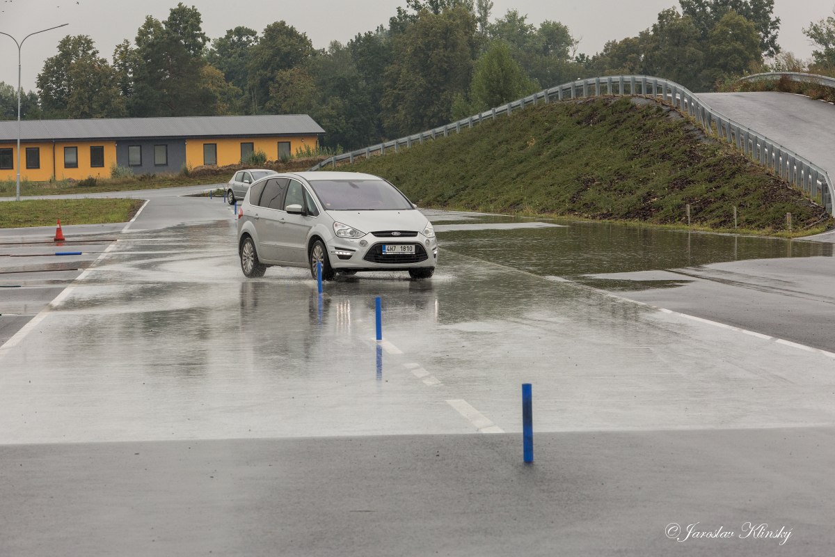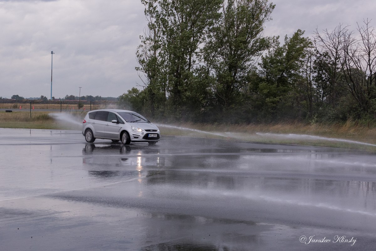 Dalším blokem pro naši skupinu byla jízda do začátky vyšší rychlostí, abychom se naučili zvládat vzniklý smyk. Část vozovky byla natřena speciální barvou, která pod vodou klouzala – simulace ujetého sněhu. Nějak se mi nedařilo auto utrhnout, musel jsem jet opravdu rychleji, abych šel trochu do smyku. Ale někteří kolegové a kolegyně jeli tak, že minuli tuto natřenou plochu…