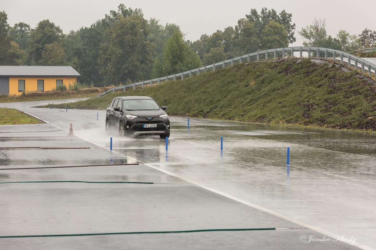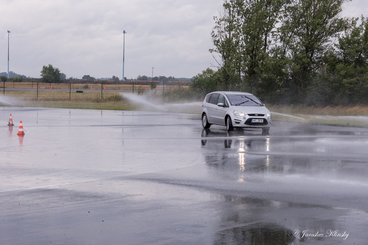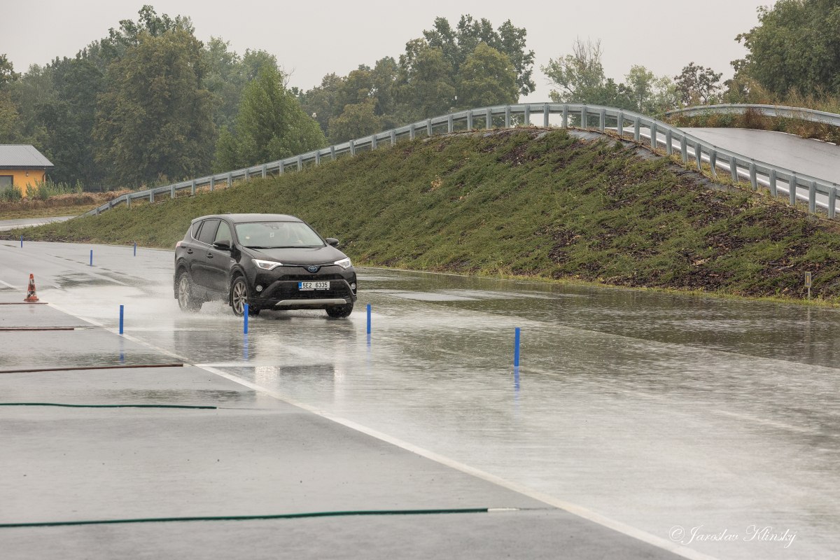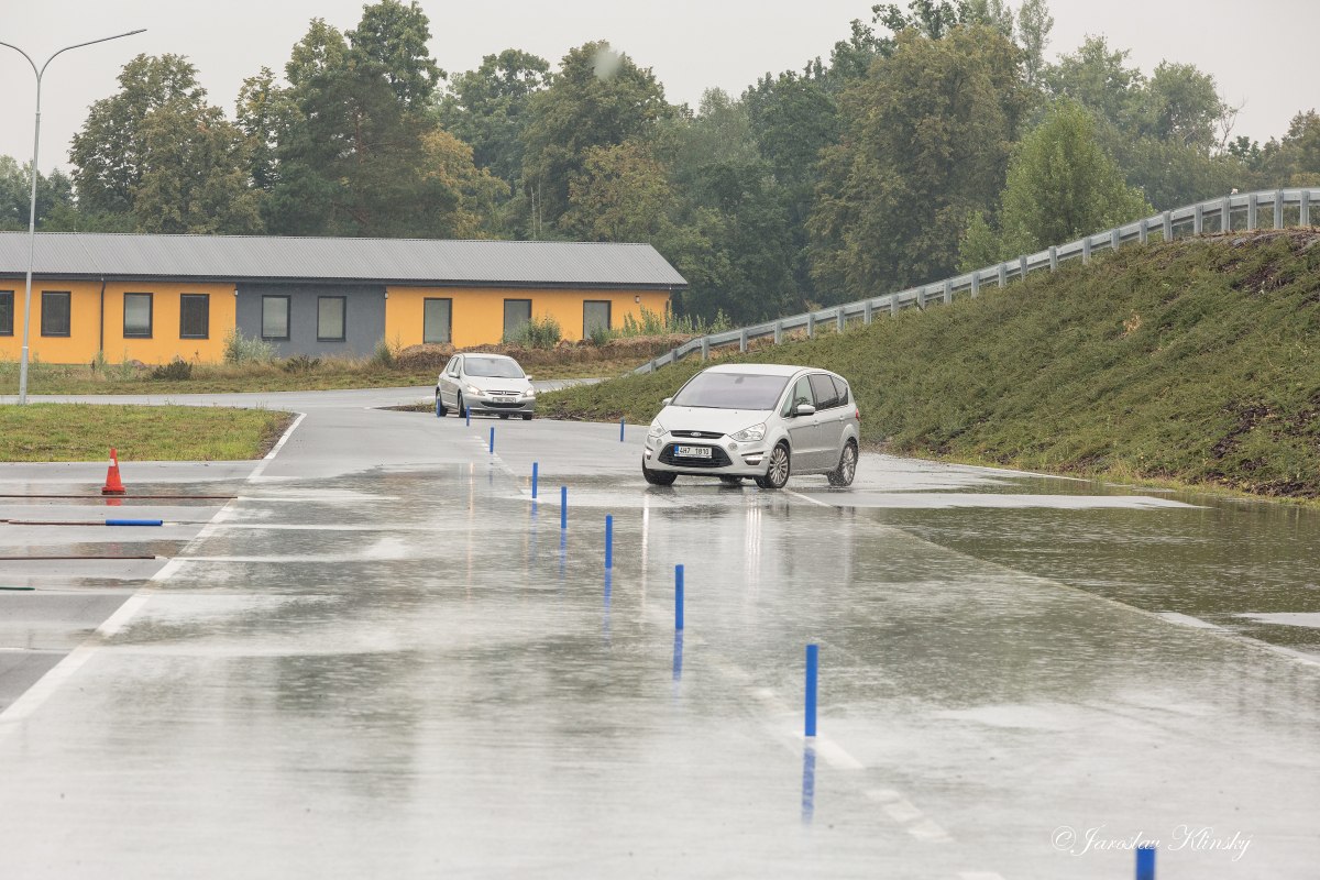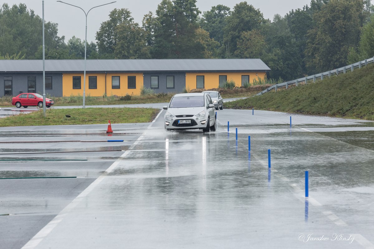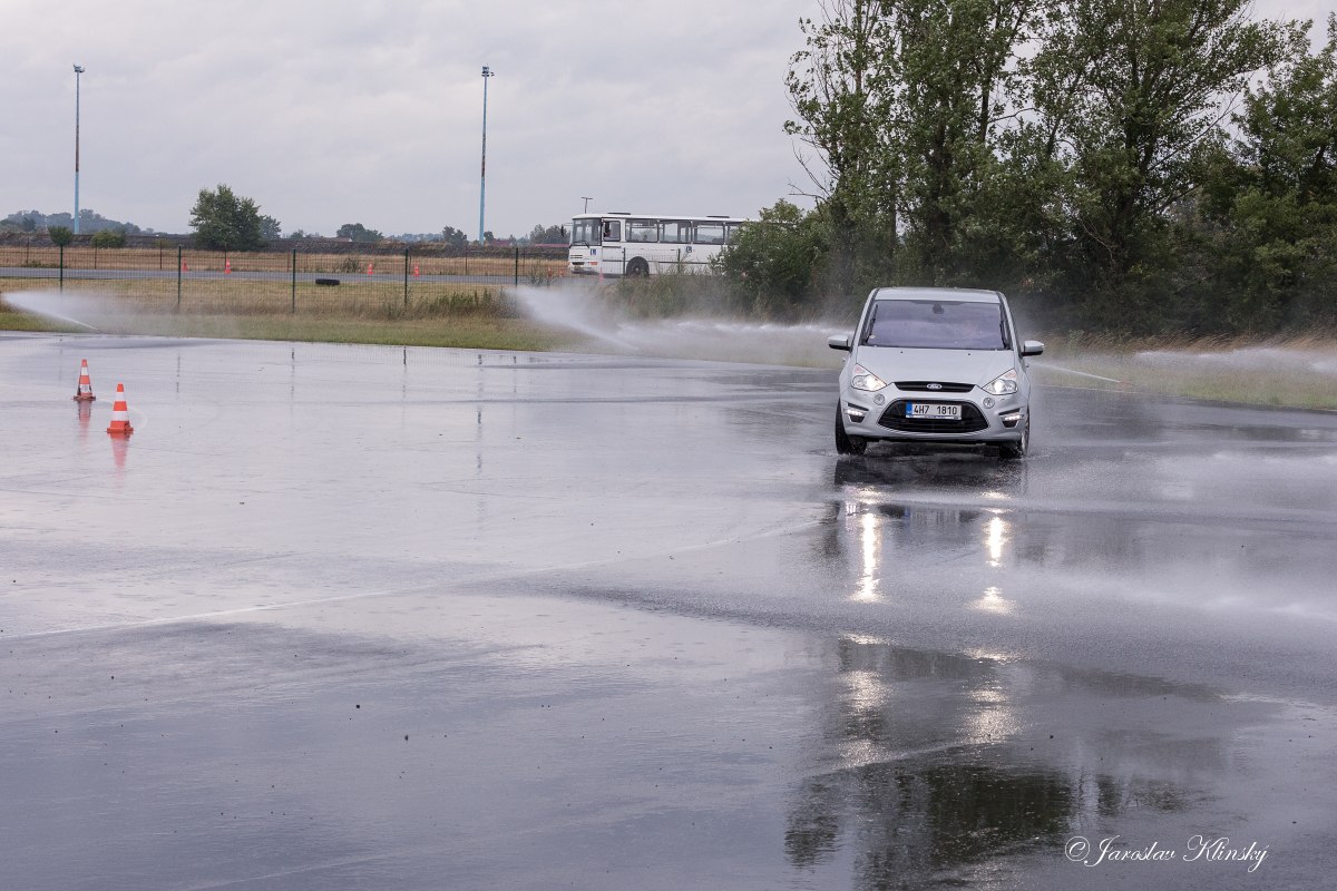 Dalším blokem pro naši skupinu byla jízda do začátky vyšší rychlostí, abychom se naučili zvládat vzniklý smyk. Část vozovky byla natřena speciální barvou, která pod vodou klouzala – simulace ujetého sněhu. Nějak se mi nedařilo auto utrhnout, musel jsem jet opravdu rychleji, abych šel trochu do smyku. Ale někteří kolegové a kolegyně jeli tak, že minuli tuto natřenou plochu…