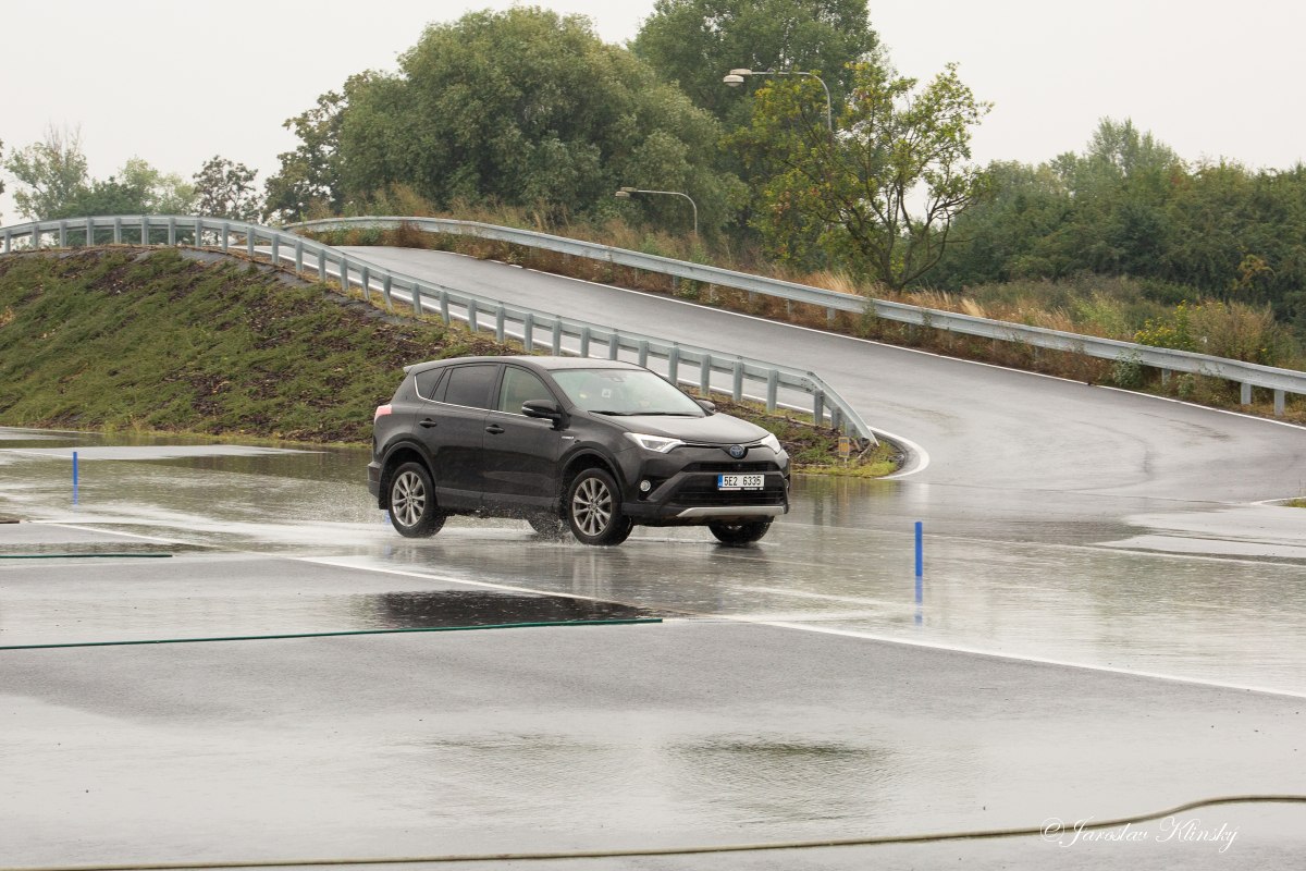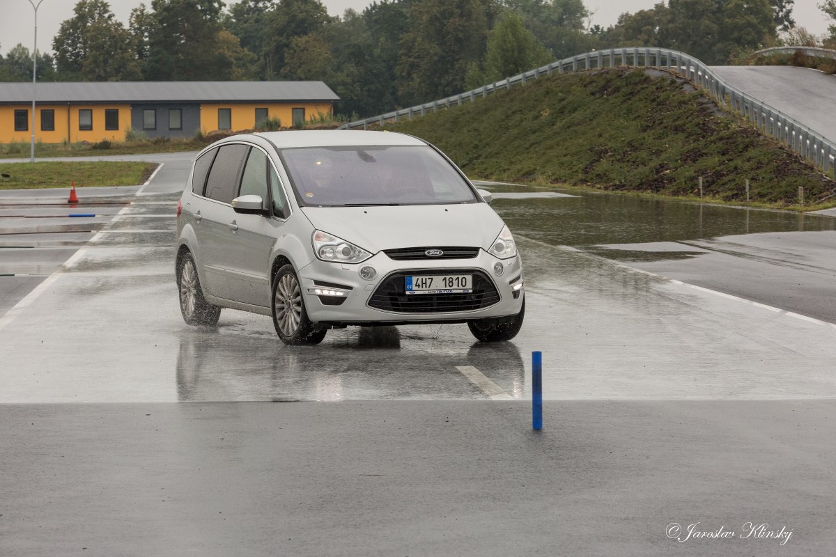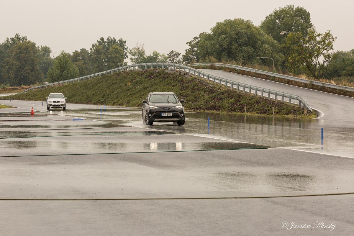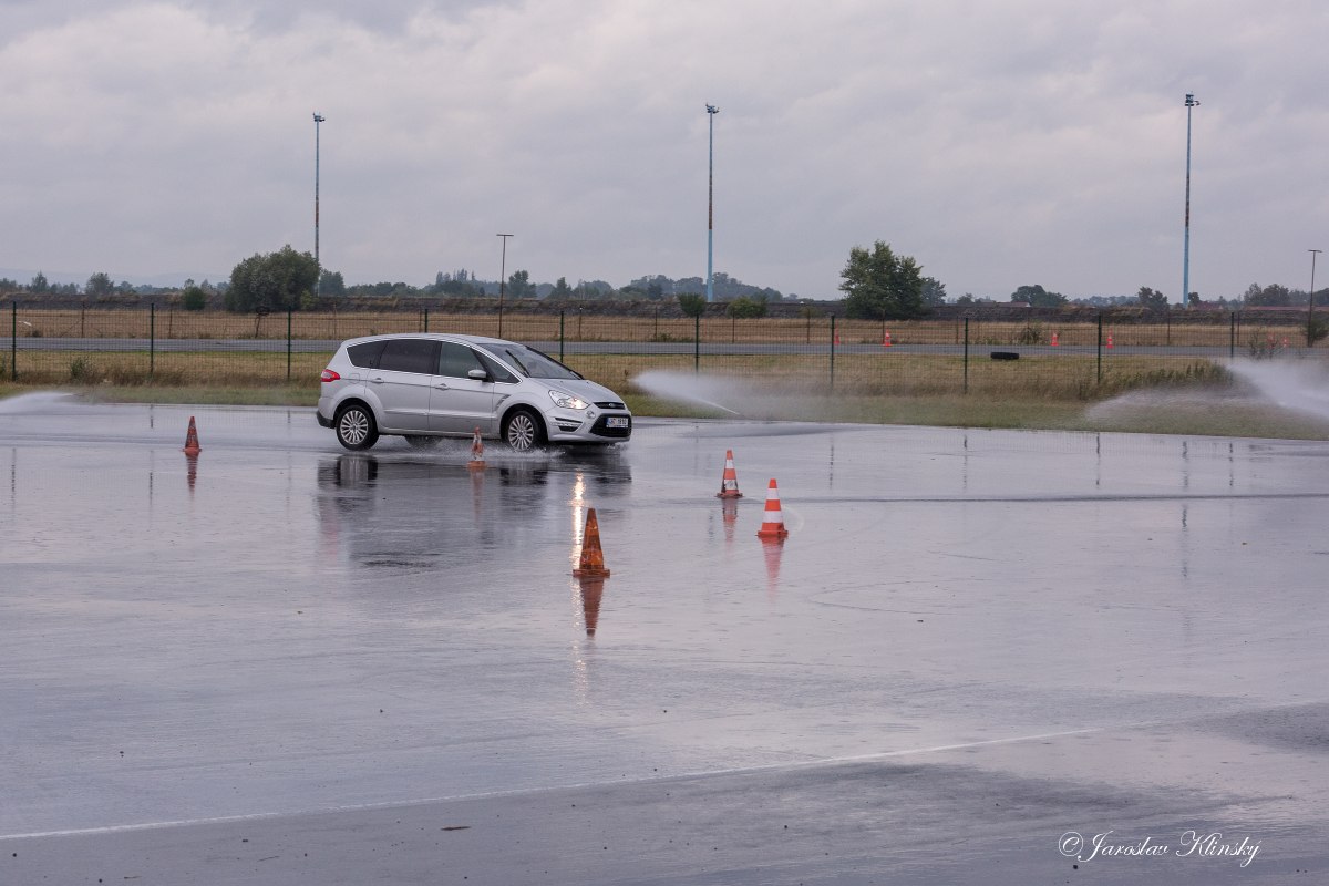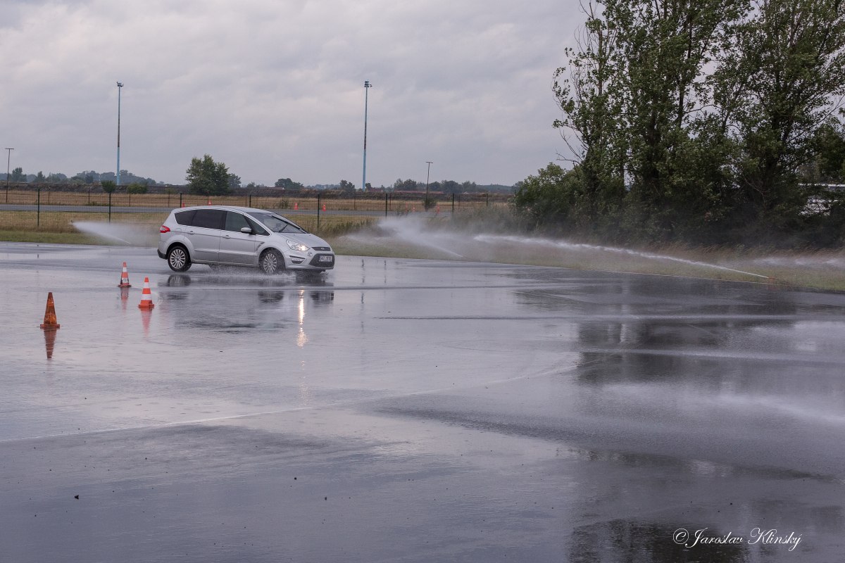 Dalším blokem pro naši skupinu byla jízda do začátky vyšší rychlostí, abychom se naučili zvládat vzniklý smyk. Část vozovky byla natřena speciální barvou, která pod vodou klouzala – simulace ujetého sněhu. Nějak se mi nedařilo auto utrhnout, musel jsem jet opravdu rychleji, abych šel trochu do smyku. Ale někteří kolegové a kolegyně jeli tak, že minuli tuto natřenou plochu…