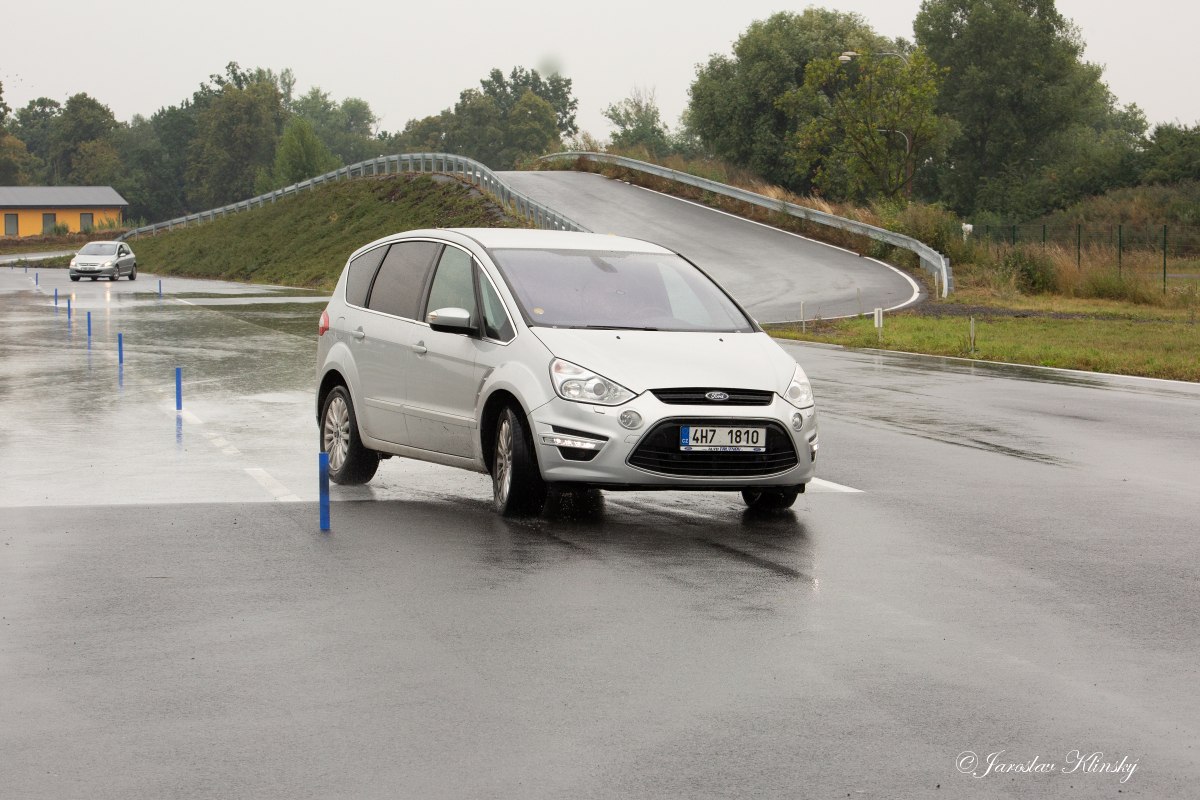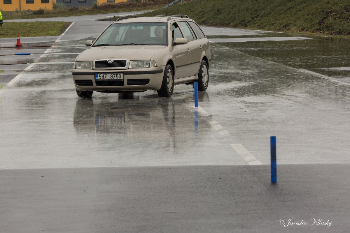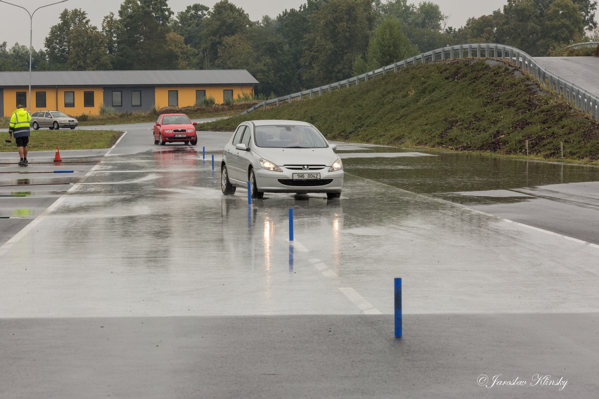 Následující kolo – měli jsme se rozjet na cca 50-60km/hod a v označeném místě začít intenzivně brzdit. A ještě musím říci, že opět to bylo na kluzkém terénu. Šlo o to, abychom zjistili, jak dlouho budeme brzdit – tedy spíše jakou vzdálenost ujedeme. Totéž jsme si zopakovali ve vedlejším pruhu, kde byl pouze mokrý asfalt. Brzdná dráha byla podstatně kratší!!! Slalom člověk dokáže jet na lyžích, na kole, ale v autě? Samozřejmě také!!!! I to jsme vyzkoušeli. Zpestřením bylo, že jsme měli objet překážku a zabrzdit, to v prvním případě. V druhém totéž, ale snažit se vrátit do původní jízdní dráhy. Prostě se vyhnout překážce!!